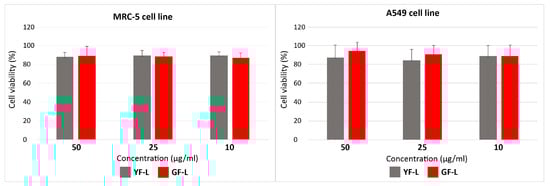The viability of the MRC-5 and A549 cells exposed to the concentrations of 10, 25 and 50 µg/mL of YF-L and GF-L samples for 24 h, expressed as percentages of the control cells viability, are shown in Figure 8. As observed from the graphs, all cells treated exhibited more than 80% viability, at all concentrations of both samples. The cell viability was highly preserved after a 24-h exposure, being above 80% for all examined concentrations of both samples. There was a negligible difference between the groups treated with various concentrations of GF-L, where no concentration dependency was observed. On the other hand, the viability of A549 treated with YF-L at the concentration of 25 µg/mL, was found to be slightly reduced compared to the viability of MRC-5 cells (at the same concentration). These results confirm that both samples are outstandingly biocompatible with human cells.