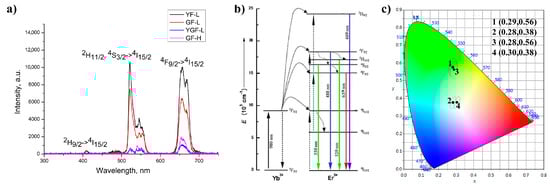 Figure 9a shows the UC emission spectra of all samples under 976 nm excitation. The visible emissions from 2H9/2 → 4I15/2, 4F7/2 →4I15/2, 2H11/2,4S3/2 → 4I15/2, and 4F9/2 →4I15/2, transitions of Er3+ ions were detected at 409, 488, 520/550, and 659 nm, respectively. As shown in Figure 9b, the population of the excited states in Er3+ ions are due to energy transfer from the Yb3+ sensitizer. Initially, Yb3+ ions were excited from the 2F7/2 ground state to the 2F5/2 excited state through the absorption of the incident photons. This energy is transferred further to the 4I11/2 state of the Er3+ ion. The population of the 4I11/2 state also occurs through the direct excitation of Er3+ ions from their ground 4I15/2 state. The population of the higher 4F7/2 and 4F9/2 Er3+ levels occurs either through energy transfer from another excited Er3+ ion which is in close proximity, or through a two-step energy transfer from Yb3+ to the neighboring Er3+ ions. The populated 4F7/2 state of Er3+ ions relax radiatively to the ground 4I15/2 state or non-radiatively decay to the 2H11/2 and 4S3/2 states, from which radiative de-excitations to the ground 4I15/2 state generate green emission at 520 nm (2H11/2→ 4I15/2) and 550 nm (4S3/2 → 4I15/2). Red emission appears due to the 4F9/2 → 4I15/2 de-excitation which could be additionally intensified by the non-radiative 4F7/2 → 4F9/2 relaxation. The strengthening of the red emission in YGF-L and Gd-H samples could be a consequence of the appearance of an additional mechanism which involves a successive energy transfer by three photons excitation, as it is corroborated in our previous work [29] and also in [30], but further studies are needed to confirm it. Weak blue emission at 409 nm is due to radiative relaxation of the highest 2H9/2 state, which is populated by successive energy transfer [29,31,32,33]. Since the intensity of each emission is determined by the probability of radiative and non-radiative transitions in particles, as well as their crystallinity, the calculated CIE color coordinates differ, as it is shown in Figure 9c.