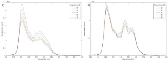 The green parts of spectrograms recorded for YF-L and GF-L in the physiologically interesting temperature range of 25 °C to 50 °C, are shown in Figure 10a,b. A clear decrease in the intensity of individual lines with increasing temperature is clearly notable. The difference in the change rate in the intensity of individual lines is not visible to the naked eye because of the relatively narrow temperature range. In the Yb-Er3+ type systems, TCL levels which are of interest are usually 4S3/2 and 2H11/2 levels of Er3+, and their transitions to the level 4I15/2, are taken to calculate the LIR. These transitions are traditionally labeled as 550 nm and 520 nm in Figure 9b, although they have slightly different values, as can be seen in Figure 10. Also, it is evident that there are more than these two lines in the luminescence spectra shown in Figure 10, and that line intensities cannot simply be read as the local maxima of the spectrograms. Therefore, more realistic values of the centers and widths of these lines were obtained by deconvoluting of the recorded spectrograms, using the fitting that assumes a Gaussian shape of the lines. The initial values for the deconvolution process, performed using MATLAB, were determined from the spectrograms as the positions and widths of the obvious peaks. The resulting LIRs for different temperatures are shown in Figure 11a,b.