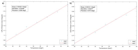 The accuracy and precision of an LIR-based temperature measurement system depend on the sensitivities given above, and also on many characteristics of the measurement system, among which the signal/noise ratio in the captured spectrogram is the most important. However, all characteristics that cause measurement uncertainty can be jointly quantified by the standard deviation of the measured LIRs, obtained over many measurements, taken at a certain fixed temperature. If we denote this quantity by σa, the precision of the temperature measurement ΔT can be calculated by the expression: