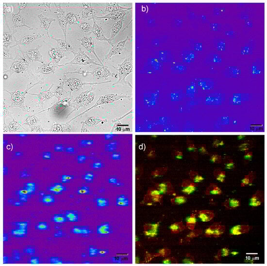 Two-photon excited (auto)fluorescence of A549 cells and the up-conversion of GF-L mesocrystals were recorded using a custom made nonlinear laser scanning microscope with the excitation wavelengths of 730 nm and 976 nm, respectively. Microscope set-up description is given elsewhere [17,18]. The signal was collected in back reflection, using an oil immersion objective lens with high a numerical aperture (EC Plan-NEOFLUAR, NA = 1.3; Carl Zeiss AG, Oberkochen, Baden-Württemberg, Germany). A visible wide range bandpass filter (400–700 nm) was used to filter out the laser and transmit only the signal. Obtained raw data was processed and analyzed using ImageJ software (1.47v, National Institutes of Health, Bethesda, MD, USA).