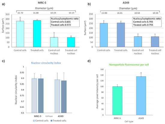 Comparison of cell morphology parameters in terms of average surface, diameter and (in inserts) nucleus/cytoplasmic ratio in control and GF-L-treated group of MRC-5 (a) and A549 cells (b); nuclear circularity indexes of control and treated cells (c); average fluorescence per cell, as calculated from the pixel intensity in filtered images. Measurements were performed by using laser microscopy images and ImageJ software. Statistical significance threshold was p < 0.05 and is represented by *(d).