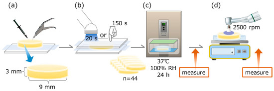Schematic of specimen preparation. (a) Filling materials into the acrylic ring. (b) For EUF, BFP, and FLC, light curing from both top and bottom sides for 20 s each. For FGP, finger pressure was kept for 150 s (n = 44). (c) After storage for 24 h at 37 °C, 100% relative humidity (RH), surface gloss, roughness, and color were measured. (d) After prophylaxis, the specimen surface at 2500 rpm, surface gloss, roughness, and color were measured again.