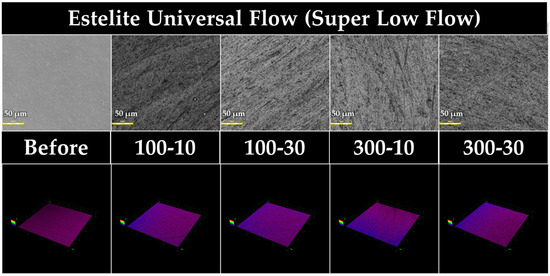 Figure 2, Figure 3, Figure 4 and Figure 5 show 3D measuring laser microscope images of the surface of a sample under the baseline and prophylaxis conditions. The upper and lower panels show images in 2D and 3D observation mode, respectively. In BFP and FLC, surface roughness was observed after prophylaxis compared with the findings at the baseline, and multiple craters were observed in FGP, suggesting that the glass powder had fallen out because of prophylaxis.