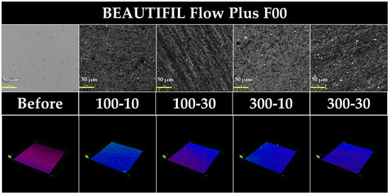 Representative 3D measuring laser microscopy images of BFP (BEAUTIFIL Flow Plus F00). Bar scale = 50 µm.
