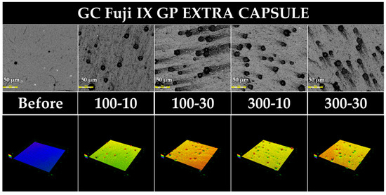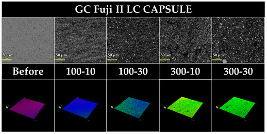 In preparing the baseline samples, those with bubbles, wrinkles, or scratches that were visually apparent were excluded. As a result, 40 specimens from each group were randomly assigned to four groups, and no significant differences were observed in the loss value or Ra value among the four groups. These results confirm that the random assignment resulted in an almost equal distribution of the samples. Encapsulated GICs have been reported to exhibit less variation in terms of the powder/liquid ratio than manually mixed GICs, with less variation depending on the skill of the operator [40,41,42]. It has also been reported that encapsulated GICs have higher mechanical properties because of less air bubble contamination [43]. In this study, the mechanical kneading types FLC and FGP were used with the aim of minimizing sample-to-sample variation.