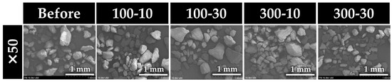 Four additional Estelite Universal Flow disc-shaped specimens were prepared. Each sample was subjected to prophylaxis 1× under the conditions from Group 1 to Group 4. Afterward, the used prophylaxis paste was rinsed in a disposable petri dish. The water used was carefully removed, and only the paste particles were collected on carbon tape attached to an aluminum slab with a disposable dental microbrush (Benda Micro, Centrix, Shelton, CT, USA). The particles were Au–Pd-coated with a cooled sputter coater (MSP-20-UM Automatic Magnetron Sputter, Vacuum Device, Mito, Japan). The coated specimens were examined through scanning electron microscopy (SEM; SU6600, Hitachi, Tokyo, Japan) at 15 kV.