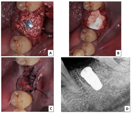 In the CMX group, a partial horizontal incision in the periosteum of the vestibule was made to release the flap (Rehrmann maneuver). A collagen membrane (COVER®; Nueva Galimplant S.L.U., Sarria, Spain) was used to cover the xenograft (Figure 1).