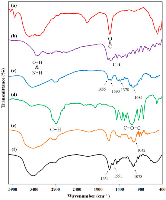 Figure 1c is the spectrum of Chit powder. Here, it is obvious that the stretching of intra- and intermolecular O–H overlapped with stretching NH2 vibrations at 3440 cm−1. The peaks at 2874 cm−1 relate to the asymmetric C–H vibrations. The vibrational mode of amide I, II, and III was observed at 1655, 1590, and 1378 cm−1, respectively. The absorption peak of C-O-C groups was revealed at 1084 cm−1, while the small peak at around 900 cm−1 is attributed to the wagging of the saccharide structure of Chit [23].
