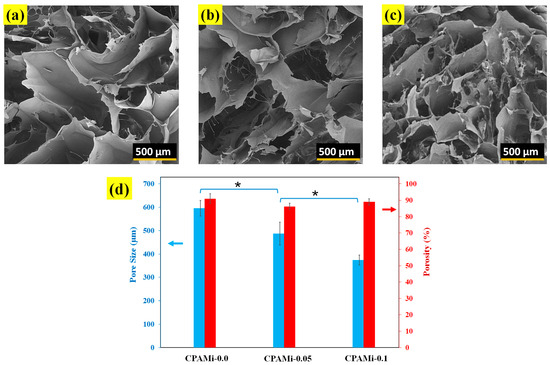 SEM images of (a) CPAMi-0.0, (b) CPAMi-0.05, and (c) CPAMi-0.1 hydrogels and (d) attributed pore size and porosity bar charts for the samples. * represent significant difference p < 0.05.