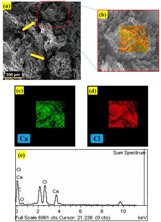 Microscopic analysis of sample CPAMi-0.1 (a) SEM surface micrograph, (b) SEM micrograph of alginate/tetracycline bead, (c) Ca mapping, (d) Cl mapping, and (e) EDS elemental pattern.