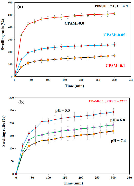 The polymers comprising pH-responsive hydrogels are high-molecular polymers that undergo a volume transition when the pH value of the external environment changes. Thanks to these properties, appropriate polymer selection can affect the swelling of hydrogels in mediums of different pH values and thus influence the drug release profile in the desired mediums. In order to investigate the effect of pH on swelling, this test was performed in the media with different pHs. The swelling results of developed hydrogel in different buffers against time are shown in Figure 4b. The swelling ratio of the CPAMi-0.1 hydrogel at pH = 5.8 increased to 250% after 300 min, which was significantly higher than the swelling ratio at neutral pH (p < 0.05). Chitosan has pH-sensitive properties due to the protonation–deprotonation of the free amino groups. Acidic media promotes the protonation of amino groups (–NH2) of the chitosan to the ammonium ions (–NH3+). Electrostatic repulsive forces and a decrease in osmotic pressure at lower pH due to the presence of more ionic groups caused an increase in swelling. As the pH increases, the hydrogel swelling ratio also decreases which was attributed to the deprotonation of the ammonium ions.
