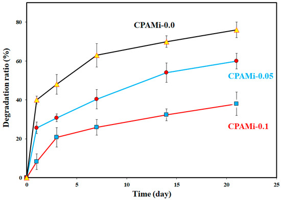 The hydrogel degradation rate is a crucial parameter in tissue engineering since chronic inflammation happens because of the long-term existence of scaffolds within the body. Thus, the degradation rate of them should be coordinated with tissue regeneration [35]. The degradation ratio of the CPAMi hydrogel over time is given in Figure 5.
