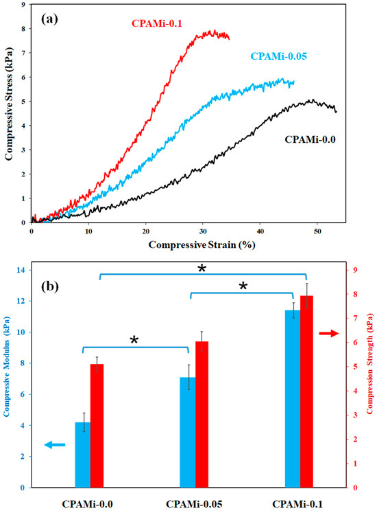 Compression experiment: (a) Compressive stress–strain curves, and (b) Compressive properties of the CPAMi hydrogels. * represent significant difference p < 0.05.