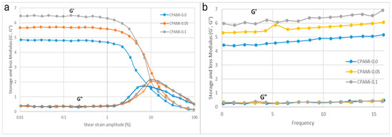 To assess the durability of the hydrogels for practical applications, amplitude-scan and frequency-scan rheology were conducted. As shown in the results (Figure 7), the storage modulus (G′) remained consistently higher than the loss modulus (G″) across a wide range of strains and frequencies, indicating the solid-like behavior and mechanical integrity of the hydrogels. Notably, the CPAMi-0.1 hydrogel exhibited the highest storage modulus, demonstrating superior mechanical stability and resilience under mechanical deformation. This suggests that the incorporation of Pluronic enhances the structural rigidity of the hydrogel, making it more durable for practical applications such as wound dressing, where maintaining mechanical strength under stress is crucial.