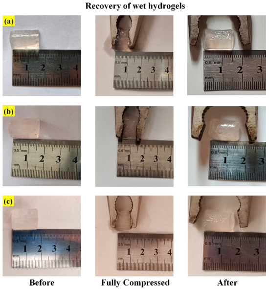 Images exhibit the recovery profiles of (a) CPAMi-0.0, (b) CPAMi-0.05, and (c) CPAMi-0.1 hydrogels. All Samples showed instant recovery after full compression using pliers.