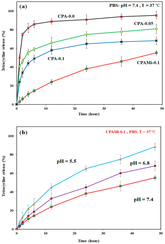 A wound dressing should have a controlled drug-release ability to avoid frequent replacement and lower the risk of overexposing the wound to bacteria. Therefore, this study is conducted to take advantage of Plr and Alg beads on controlled delivery of TC. For in vitro release experiments, TC release from CPA-0.0, CPA-0.05, CPA-0.1, and CPAMi-0.1 was analyzed in PBS with different pHs at 37 °C, and the results are displayed in Figure 9a,b.