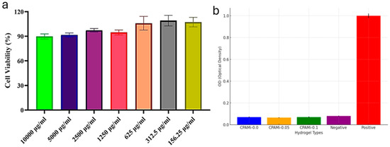 Despite all the advances in the development of polymeric-based hydrogels, there are still concerns regarding the potential adverse effects of hydrogels on healthy cells. As a matter of fact, an ideal hydrogel for the purpose of in vivo and in vitro usage should not impose any toxicities on cells. Consequently, the biocompatibility of the hydrogels was evaluated with the HFF2 cell line utilizing the MTT method. As shown in Figure 10a, according to the MTT results, composite hydrogel over a broad variety of concentrations had no deleterious effects on HFF2 cells even at a high concentration of (10 mg/mL). Indeed, the cell viability rate did not decrease considerably by increasing the hydrogel concentration. The survival rate was close to 100% or even beyond in concentrations lower than 2.5 mg/mL while hydrogels at a concentration of 10 mg/mL exhibited a 90% cell survival rate [45]. From the ANOVA test, there were no statistical differences (p < 0.05). The hemocompatibility of the developed hydrogels was assessed by measuring the optical density (OD) as an indicator of red blood cell lysis in contact with the hydrogel samples. As depicted in Figure 10b, all hydrogel formulations (CPAMi-0.0, CPAMi-0.05, and CPAMi-0.1) exhibited low OD values, similar to the negative control, indicating negligible hemolytic activity. In contrast, the positive control showed a significantly higher OD value, suggesting substantial red blood cell damage. The low OD values for all hydrogel types confirm that they do not induce hemolysis and are therefore hemocompatible.