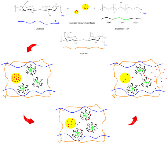 Characterization of the CPA hydrogel containing Alg-TC drug carrier beads (CPAMi) systems was monitored first in FT-IR analysis. The FT-IR spectra of the Alg, TC, Chit, Plr, Aga, and final hydrogel in the region 400–4000 cm−1 were presented in Figure 1. Also, the molecular structure is depicted in Scheme 2.