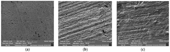A scanning electron microscope (Tescan, VEGA3 VP-SEM, Brno, Czech Republic) was utilized to examine one specimen from each material group before and after acidic storage. Each specimen was affixed to aluminum stubs (12 mm thickness) using double-sided adhesive tabs and sputter-coated with silver. Scanning electron micrographs were captured at a magnification of 1.00 kx, accelerating voltage of 5 kV, spot size of 3.5, and working distance (WD) of 14 mm focusing on representative areas of the samples.