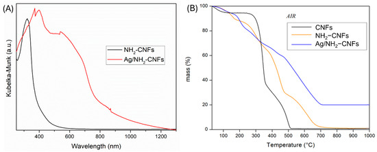 (A) Kubelka-Munk transformations of reflection data of NH2−CNFs and Ag/NH2−CNFs. (B) TG curves, measured in the air at a heating rate of 10 °C/min, of CNFs, NH2−CNFs, and Ag/NH2−CNFs.