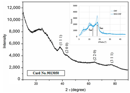 The XRD spectra of CNFs and NH2−CNFs, shown in the inset of Figure 2, correlated with the literature data [34], exhibiting the principal peaks around 16.5, 22.5, and 35° which is attributed to the overlapping (1–10) and (110), (200) and (004) planes of monoclinic cellulose, respectively. The empirical equation was applied to calculate the crystallinity index (CI) of CNFs and NH2−CNFs using the intensity of the highest XRD peak (I002) and the minimum intensity at a position between the (002) and the (101) peaks (IAM), which was at about 18.3° [35]: