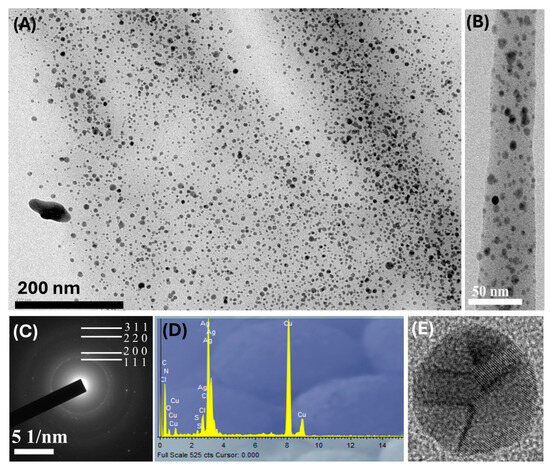 Low-magnification TEM images of Ag/NH2−CNFs composite (A,B) and corresponding SAED pattern (C) as well as EDX spectrum (D). High-magnification TEM image of typical Ag NP attached to NH2−CNFs support (E).