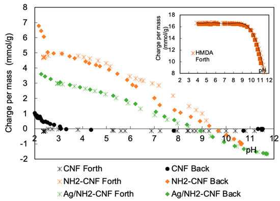 Potentiometric titration curves of native CNFs, NH2-CNF, and Ag/NH2-CNF with corresponding charges suspended in water; concentration: 0.001 wt.%. Inset: the titration curves (forth and back) of pure HMDA.