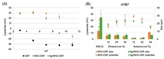 (A) ζ-potentials and (B) average hydrodynamic size distribution of native CNFs, NH2-CNF, and Ag/NH2-CNF in water and water containing different volume percent of ethanol or acetone at pH 7, analyzed by DLS; concentration: 0.001 wt.%.