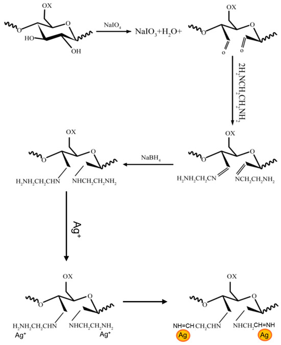 The synthesis of inorganic–organic hybrid particles consisting of Ag NPs and amino-functionalized cellulose nanofibrils (NH2−CNFs) is a two-step process (Scheme 1). In the first step, NH2−CNFs were prepared using a straight-forward procedure based on CNF oxidation by sodium periodate (NaIO4) to obtain dialdehyde nanocellulose followed by a reaction with ethylenediamine (C2H4(NH2)2) through an imine intermediate, sodium borohydride (NaBH4), that provided the final product, NH2−CNFs [31,33].