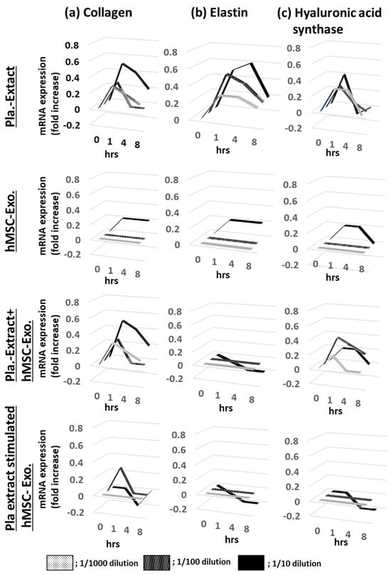 Dermal fibroblasts have been shown to be capable of synthesizing collagen, elastin, and dermal hyaluronan, as indicators for several stress responses. Therefore, the mRNA levels of these proteins were measured in the present study [18,19]. This study aimed to determine the initial mechanism of action underlying the anti-aging effect of Pla-Ext on human skin. In addition, we also investigated whether the mechanism of action was altered by MSC-Exo obtained from preconditioning, where Pla-Ext acts directly on hMSC-Exo.