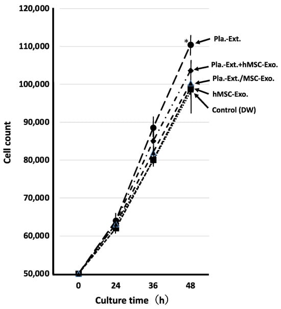 HDFs were treated with five additives, and the mRNA expression levels for collagen, elastin, and hyaluronic acid synthase were assessed over time (Figure 1a–c). After adding Pla-Ext, the mRNA expression levels tended to increase in a concentration-dependent manner from 1 to 4 h, but none significantly increased. No mRNA variations were observed in the group treated with hMSC-Exo alone. In addition, the mRNA levels following Pla-Ext and hMSC-Exo combination stimulation or hMSC–supplement exosome treatment of normal skin cells did not vary significantly. Furthermore, the effects of the five treatments on cell proliferation were examined. All treatment groups exhibited higher proliferation compared to the controls, with the Pla-Ext-treated group demonstrating the highest growth potential (a 13% increase compared to the controls at 48 h; p < 0.05) (Figure 2).