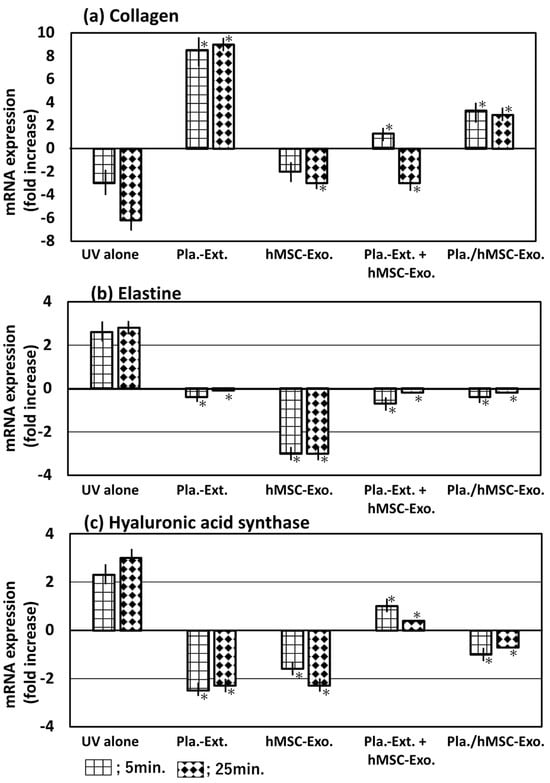 The collagen, elastin, and hyaluronic acid synthase mRNA levels were measured following treatment with the five additives and UV radiation for 5 or 25 min (Figure 3). UV irradiation decreased collagen mRNA expression levels compared to the non-irradiated group; however, it increased elastin and hyaluronic acid synthase mRNA levels. Pla-Ext increased collagen expression to counteract the response but decreased elastin and hyaluronic acid synthase expression. hMSC-Exo was not resistant to collagen but was resistant to elastin and hyaluronic acid synthase in response to UV radiation. However, co-treatment with Pla-Ext and hMSC-Exo resulted in weakened resistance. Furthermore, the exosomes obtained by stimulating hMSCs with Pla-Ext were resistant to the three parameters.