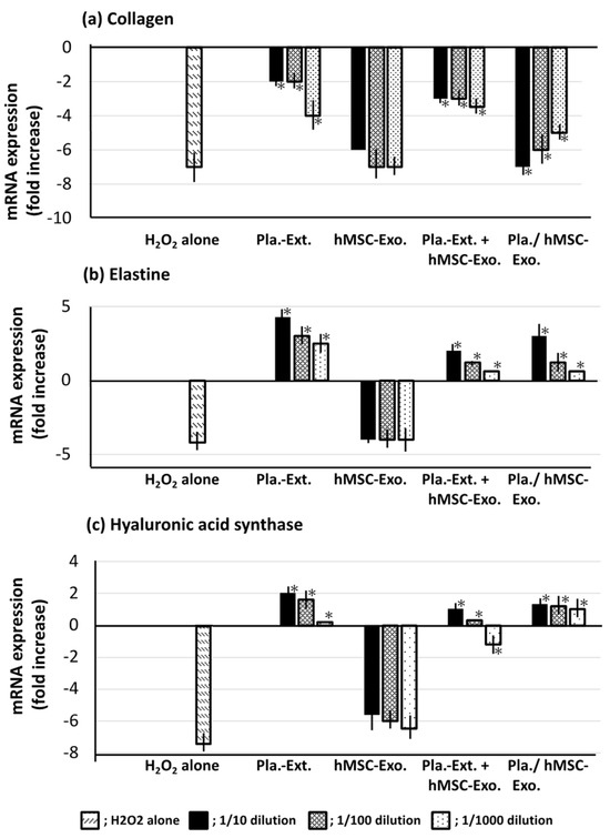 Effects of Pla-Ext on (a) collagen, (b) elastin, and (c) hyaluronic acid synthase in human dermal fibroblasts treated with H2O2. Pla-Ext, placental extract; hMSC-Exo, human mesenchymal stem-cell-derived exosomes; Pla extract-stimulated hMSC-Exo; Placenta extract-stimulated human mesenchymal stem-cell-derived exosomes. * p < 0.001 vs. H2O2 alone.