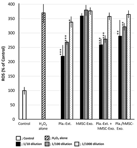 Effects of Pla-Ext on the generation of reactive oxygen species (ROS) in human dermal fibroblasts treated with H2O2. Pla-Ext, placental extract; hMSC-Exo, human mesenchymal stem-cell-derived exosomes; Pla extract-stimulated hMSC-Exo; placenta extract-stimulated human mesenchymal stem-cell-derived exosomes. * p < 0.05, ** p < 0.01, *** p < 0.001 vs. H2O2 alone.