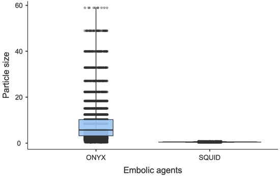 MMA embolization has proven effective in the treatment of CSDH in randomized case-control studies. CT images of CSDH obtained after embolization of MMA showed contrast enhancement of the dura mater, capsule membrane, septa, and subdural hematomic fluid, which suggested a continuous vascular network between the membranes of CSDH and MMA [2]. This connection is provided by penetrating arterioles with a diameter ranging from 5 to 15 microns. In addition, venous outflow from the dura mater could play an important role in limiting the blood supply to the CSDH capsule. The presence of arteriovenous shunts in dura mater ranging in size from 8 to 12 microns in diameter provides the possibility of embolization of the venous part of dura. Thus, a gel-like composition capable of penetrating into vessels of less than 15 microns is optimal. In 2023, N.R. Ellens et al. [51] conducted a significant meta-analysis comparing various embolic agents for MMA in CSDH. Their findings indicated that the recurrence rate, a necessity for surgical salvage, and periprocedural complications following MMA embolization were not influenced by the specific embolic agent utilized. The principal limitations of this meta-analysis pertain to the retrospective nature of the included studies. These include the considerable variability in embolization techniques. The authors themselves acknowledge that the meta-analysis only included studies that used the same embolic agent in >95% of cases, which may not fully reflect the published experience with MMA embolization. Furthermore, the analysis does not incorporate data on the utilization of SQUID (Balt), which was already documented and disseminated at the time of its publication [4]. Additionally, the findings of randomized trials [15,16,17] on NAGLEMs are not reflected in this meta-analysis. This precludes the formulation of a definitive conclusion, necessitating the conduct of further studies and meta-analyses. Upon evaluation of the shape and granulometry of the two NAGLEMs, a notable discrepancy was observed. The sample SQUID 18 exhibited medium-sized granules with a mean diameter of 0.443 ± 0.086 µm (M ± SD), which were smaller than the tantalum granules in the sample ONYX 18, with a mean diameter of 5.2 ± 0.33 µm (M ± SD). In addition, the tantalum granules in SQUID were of regular spherical shape, with a smaller size spread, and with a smaller surface area of the granules. All this explained the longer sedimentation time of SQUID 18 and the preservation of X-ray contrast estimated in other studies [29,30]. In addition to alterations in the visualization of embolic material throughout the procedure, some authors [25,52] have indicated the potential for premature microcatheter occlusion resulting from the relatively large size of tantalum granules present in ONYX (Medtronic). However, in none of our cases was there a problem with loss of visualization and occlusion of the microcatheter.