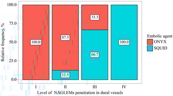 According to the presented table, when comparing gel-like embolic agents, statistically significant differences were revealed depending on the level of NAGLEMs penetration in dural vessels (p = 0.009) (applied method: Pearson’s chi-square test). The diameters of the microcatheters used by both groups were comparable, as well as their positions. No significant relationship was found between these parameters and the degree of penetration.