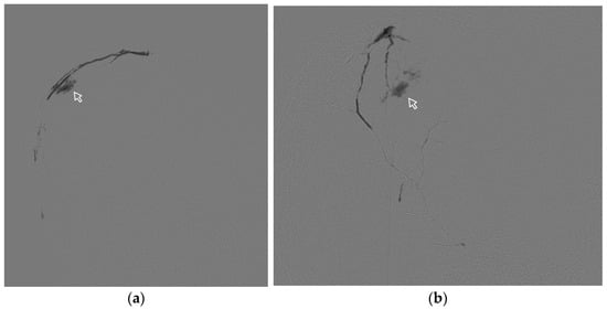 Posterior-anterior (a) and lateral (b) DSA images show the process of spreading NAGLEM (ONYX 18) along the branches of the right MMA. The white frame arrows indicate extravasation of the embolic agent (ONYX 18).