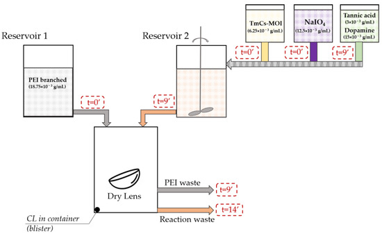 In the first stage, the contact lens (CL) container (or non-sealed blister) containing a lens in a dry state was filled with a polyethyleneimine (PEI) solution from Reservoir 1 (Figure 2). While the adsorption of PEI was ongoing, a second coating solution was prepared in a separate reservoir, Reservoir 2. Reservoir 2 was first filled with 2.4 mL of TmCs-MOI solution, followed by the addition of 0.3 mL oxidant solution. After 9 min of TmCs-MOI oxidation, 0.3 mL of the phenolic solution was added. Subsequently, the PEI solution from the lens container was replaced by the resulting solution of oxidized coating compounds and left to react for 5 min. The treated lens was then rinsed and autoclaved in the corresponding saline solution for final packaging.