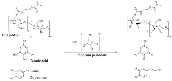 Schematic representation of the coating molecules of dopamine, tannic acid and TmCs-MOI before and after oxidation with sodium periodate.