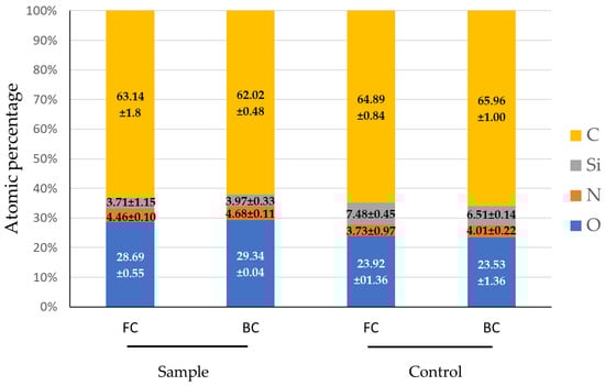 Atomic percentages were calculated to quantify these changes, as depicted in Figure 4. Four elements were detected and quantified: carbon, silicon, nitrogen and oxygen. There was an increase in the oxygen and nitrogen percentages, which was characteristic of the coating, while silicon, which was the most exposed element on the untreated surface, decreased. These findings suggest that the initial siloxane polymer surface was overlaid with a thin layer of molecules containing oxygen and nitrogen.