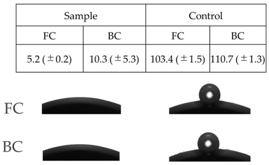 The slight difference between the results obtained for the Back Curve (BC) and Front Curve (FC) can be attributed to the specific manufacturing process, which results in the unequal wettability of the surface due to variations in the pretreatment process.