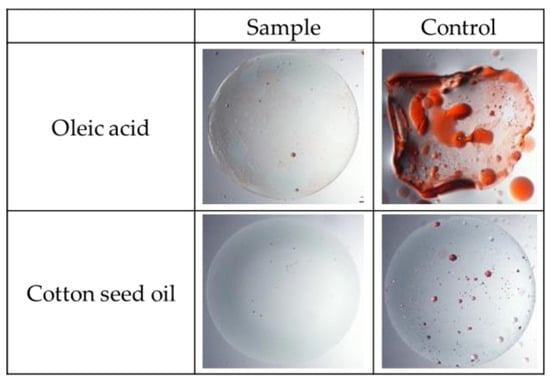 The improvement in the wettability of the contact lenses led to excellent lipid-repellent properties. Two lipid adhesion tests were conducted using Oleic acid and Cotton Seed oil. These tests simulate the potential contamination of the contact lens in the eye during the wearing process with various lipids present in tears. As shown in Figure 6, it was almost impossible to create any kind of lipid adherence to such a highly hydrophilic surface.