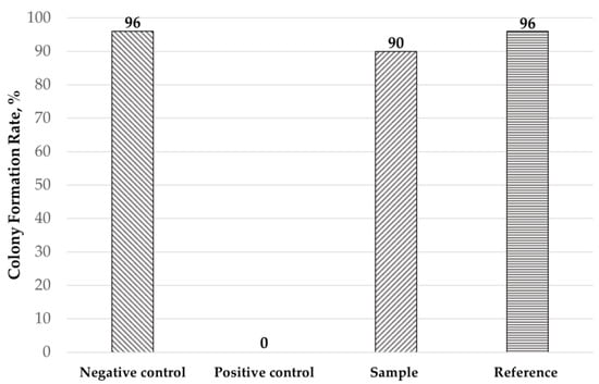 Cytotoxicity testing was performed using the colony formation method and direct contact, following the ISO 10993-5 standard, section 8.3 [19]. A known aliquot of continuously stirred cell suspension (V79 Cells; Chinese Hamster, JCRB0603) was used. Initially, positive control and negative control samples were placed at the bottom of the 24-well plate. About 50 cells were seeded into each well (24-well culture plate). After 3 to 5 h of incubation, test samples were placed at the bottom of the well. The samples were incubated for 6 days at 37 °C, with 5% CO2 using Minimum Essential Medium (MEM10) with 10% fetal bovine serum (FBS) as the culture medium. The grown colonies were treated with appropriate chemicals/dyes and were counted, and the colony formation rate (CFR) was calculated. The whole series of cell viability tests was conducted over a 14-day period.