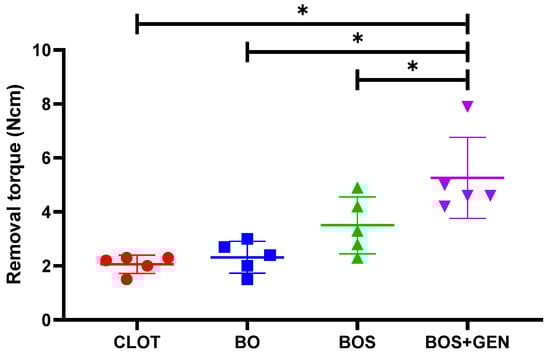 Biomechanical test of removal torque. Twenty-eight days after implant placement, each experimental group’s removal torque was tested. The removal torque was increased until the implant rotated into the bone, and the highest torque in Newton centimeters was recorded. The statistically significant difference in comparison to the BOS + GEN group (p < 0.05) is indicated by *, determined using one-way ANOVA followed by Tukey’s t-test.
