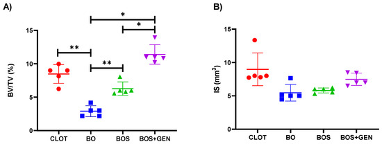 Micro-computerized tomography of peri-implant bone. Morphological parameters were estimated as follows: (A) percentage of bone volume per tissue volume (BV/TV, %); (B) intersection surface (IS; mm3). The statistically significant difference is indicated by * in comparison to the BOS + GEN group. ** denotes a statistically significant difference in comparison to the BO group. The p < 0.05 was determined using one-way ANOVA followed by Tukey’s t-test.
