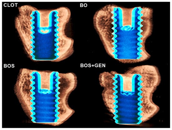 The 3D µCT reconstruction of the peri-implant bone area. The µCT images are representative of all four groups, CLOT, BO, BOS, and BOS + GEN, respectively. The microtomography images evidenced that genistein enhanced the peri-implant bone into the medullary implant threats in the BOS + GEN group. The microtomography was executed by applying the CTvox software (SkyScan, Version 2.7).