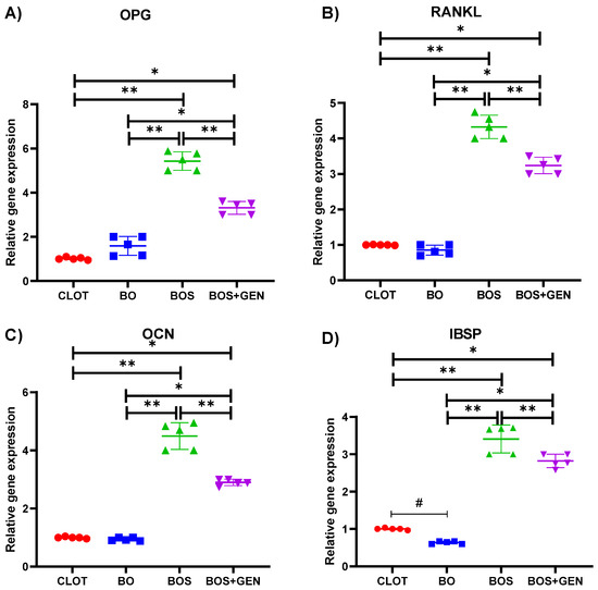 Molecular data from RT-PCR analysis of all groups. (A) OPG: osteoprotegerin; (B) RANKL: receptor activator of nuclear factor kappa-B ligand; (C) OCN: osteocalcin; (D) IBSP: bone sialoprotein. The * denotes a statistically significant difference in comparison to the BOS*GEN group. The ** denotes a statistically significant difference in comparison to the BOS group. The # denotes a statistically significant difference in comparison to the BO group. The statistically significant difference (p < 0.05) was determined using one-way ANOVA followed by Tukey’s t-test.