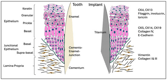 - Shimono, M.; Ishikawa, T.; Enokiya, Y.; Muramatsu, T.; Matsuzaka, K.; Inoue, T.; Abiko, Y.; Yamaza, T.; Kido, M.A.; Tanaka, T.; et al. Biological Characteristics of the Junctional Epithelium. J. Electron. Microsc. 2003, 52, 627–639. [Google Scholar] [CrossRef] [PubMed]