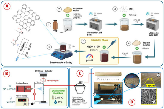 In this study, a standardized process was utilized to prepare four distinctive polymer solutions. Initially, trifluoroethanol (TFE) served as the solvent, to which GO was added at concentrations of 1.0 mg/mL, 1.5 mg/mL, and 2.0 mg/mL. GO was synthesized from graphite oxidation/exfoliation according to the Tour Method [22]. Briefly, graphite powder was oxidized using a mixture of H2SO4/H3PO4 (9:1) with KMnO4, followed by the controlled addition of H2O2 and multiple washing steps with water, HCl, and ethanol. The resulting GO was characterized by FTIR and TGA to confirm successful oxidation and exfoliation. The synthesis protocol followed our previously established methods [20], yielding GO sheets with lateral dimensions in the submicron range. The mixtures underwent cold sonication for 15 min, ensuring dispersion. Then, PCL pellets were added at a concentration of 7% (w/v) and sonicated again for 15 min for homogeneity. Gelatine type B (GT) was then added at a 3% (w/v) concentration and stirred at 200 rpm for two hours. The pH of GT was adjusted to 8 using 1M NaOH to ensure miscibility. The final solution was left stirring overnight at 200 rpm [23]. A separate solution was prepared without GO for comparison. The resulting solutions were designated as PCL-GT-GO 1.0%; PCL-GT-GO 1.5%; PCL-GT-GO 2.0%; and PCL-GT for control (Figure 1A).